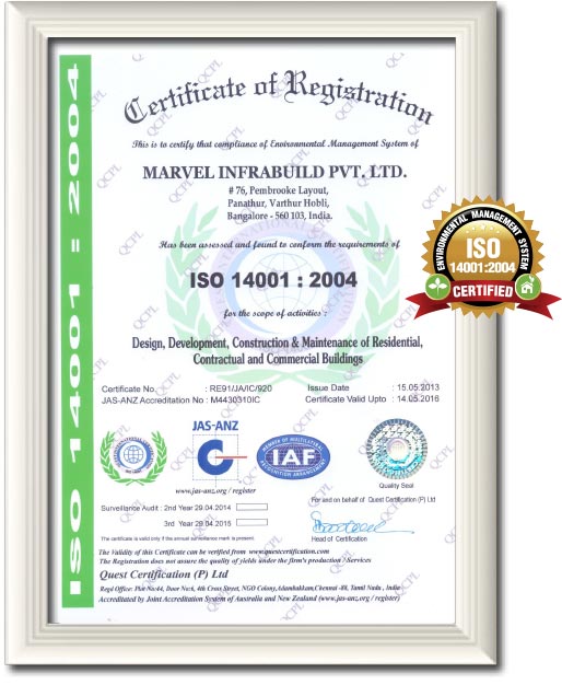 Quest International Certification (P) Ltd., an independent, third party assessment body without affiliations to any other company or organization, has assessed and certified Marvel Infrabuild. They are authorized to audit organizations and issue certificates against a variety of management systems (including ISO 9001, ISO 14001, OHSAS 18001, ISO 22000, ISO 27001 GMP, ISO 13485, HACCP and CE marking.)