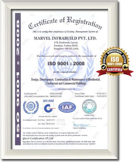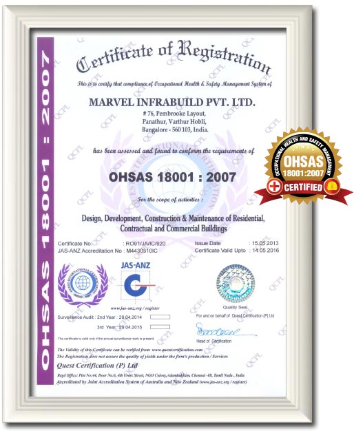 Quest International Certification (P) Ltd., an independent, third party assessment body without affiliations to any other company or organization, has assessed and certified Marvel Infrabuild. They are authorized to audit organizations and issue certificates against a variety of management systems (including ISO 9001, ISO 14001, OHSAS 18001, ISO 22000, ISO 27001 GMP, ISO 13485, HACCP and CE marking.)